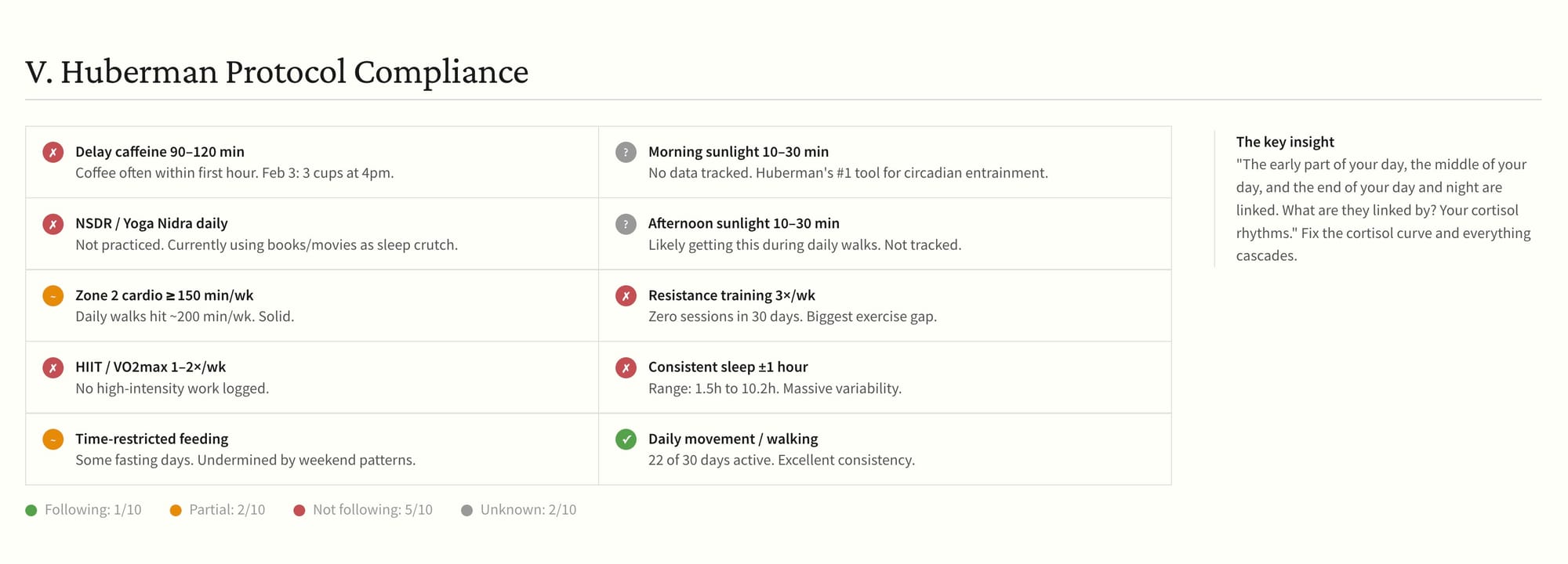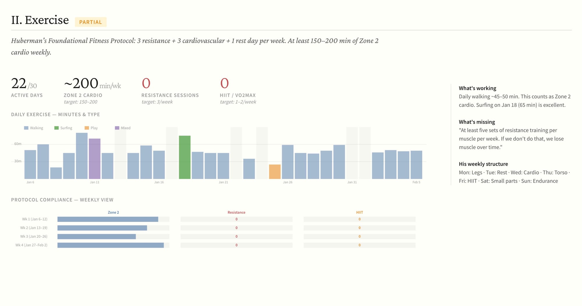 Exercise looked okay on the surface. 22 out of 30 active days. About 200 minutes per week of Zone 2 from walking. But zero resistance training sessions and zero HIIT or VO2max work. The walking was good. The rest was a big miss.