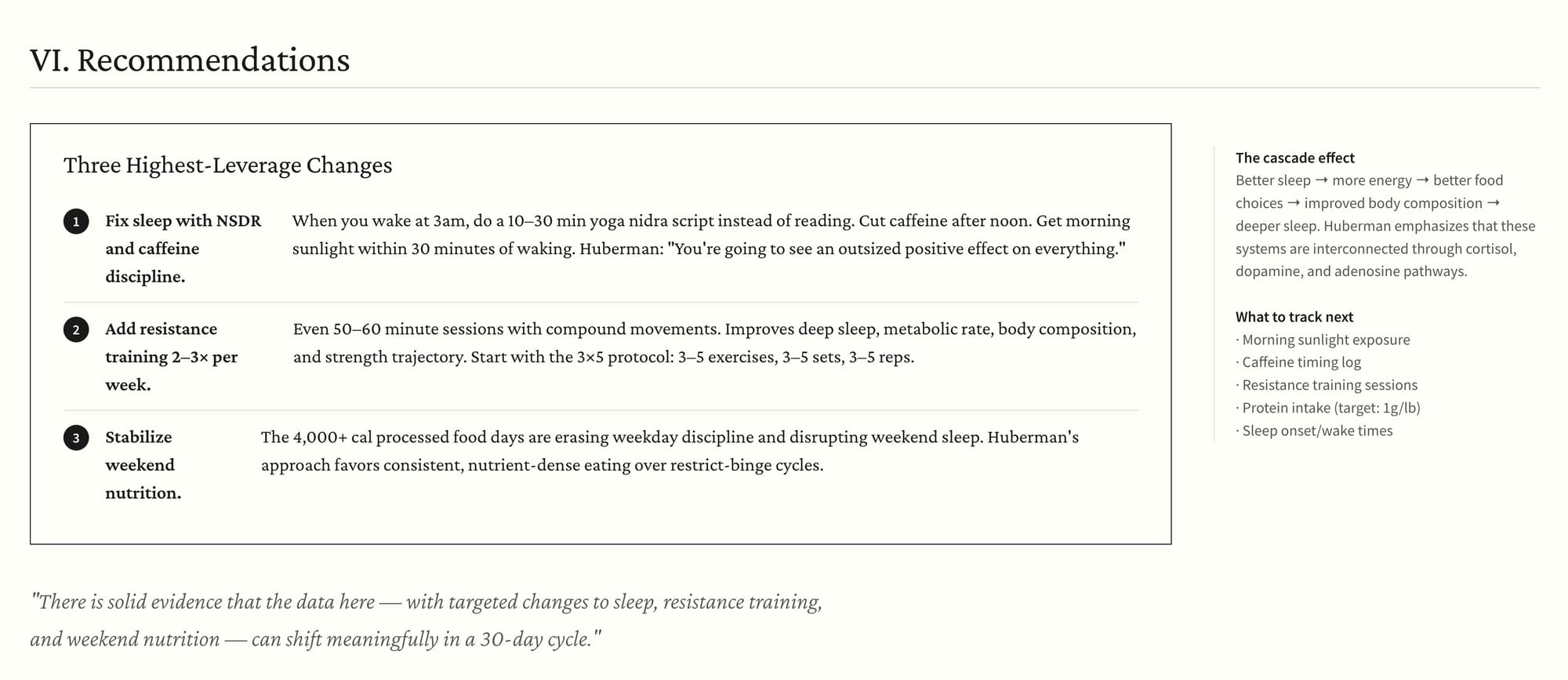 I asked Mio to analyze my last 30 days of health data against Huberman's protocols. It pulled my numbers, searched for the relevant Huberman recommendations on sleep, exercise, nutrition, and caffeine timing, and generated a full personalized analysis.