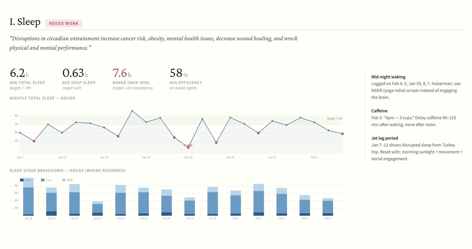 6.2 hours average. Target is 7 to 9. A 7.6-hour swing between my best and worst nights. Huberman says consistency matters as much as the average. Deep sleep averaging 0.63 hours when the target is at least 1 hour. And my classic move: waking up mid-night and reading, which is basically the opposite of what you want to do.
