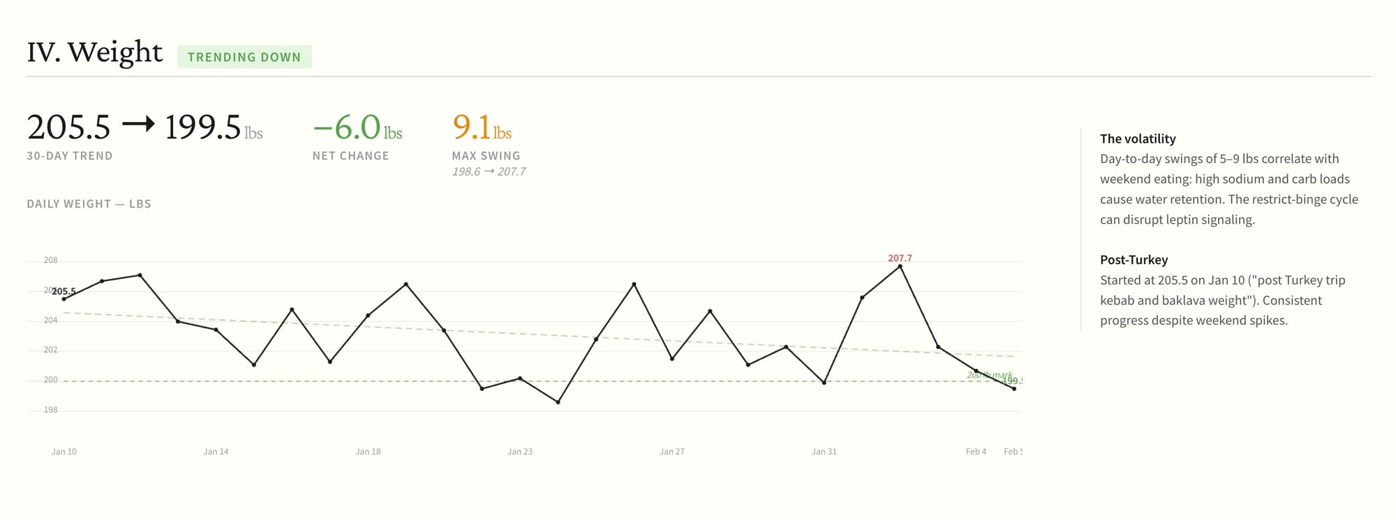 Weight was trending down anyway. 205.5 to 199.5 in the window. Down about 6 pounds. But with big swings from water retention and weekends.