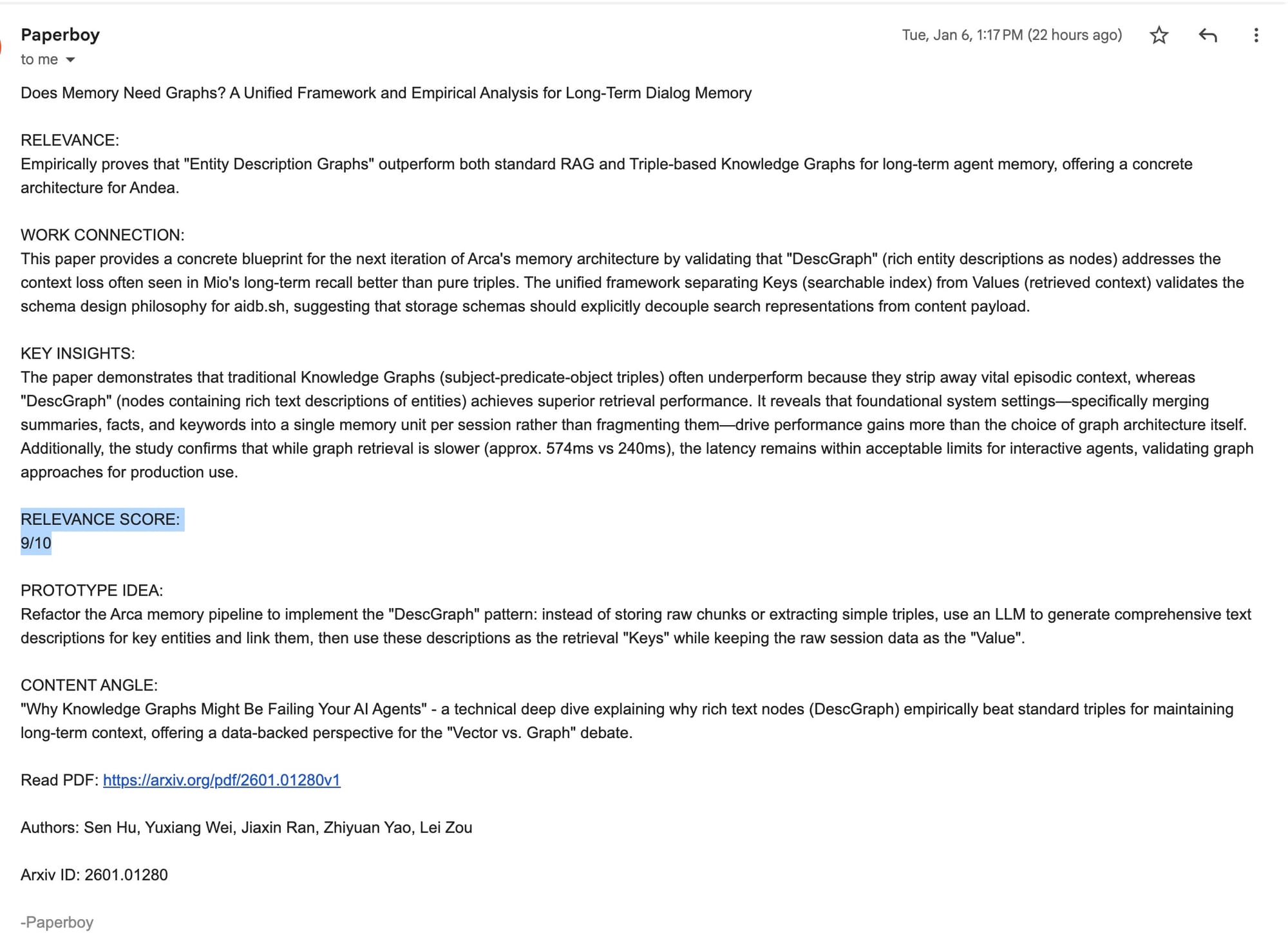 If you store your current AI projects in Arca, Paperboy can match incoming papers against your actual work. Every day it checks new papers, scores them for relevance to what you're building, and sends you only what matters.